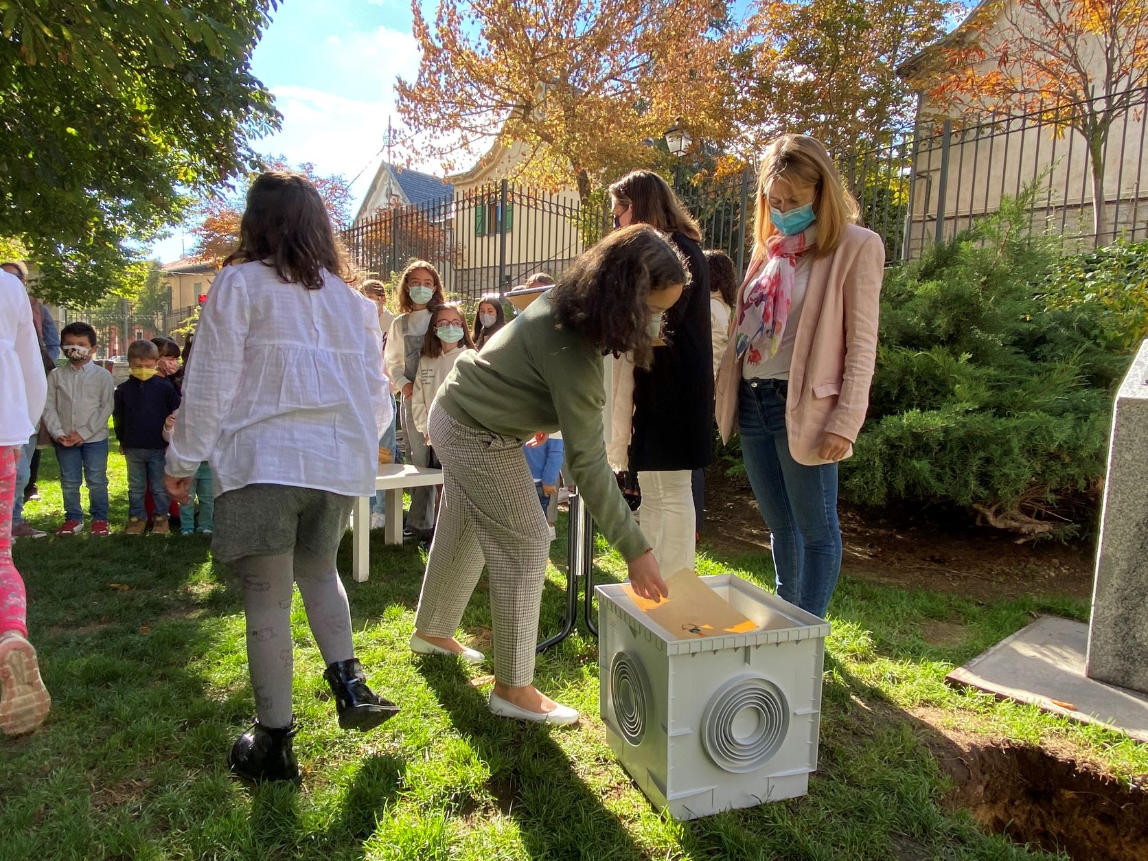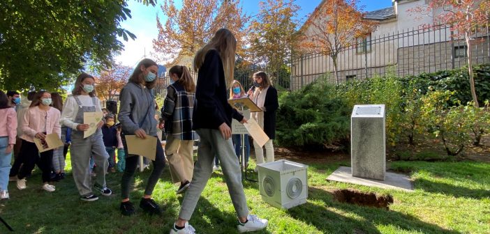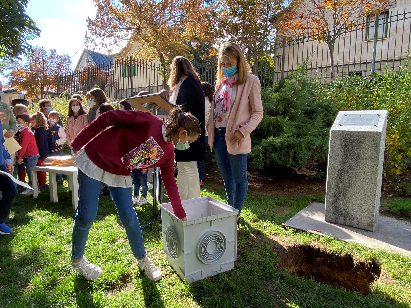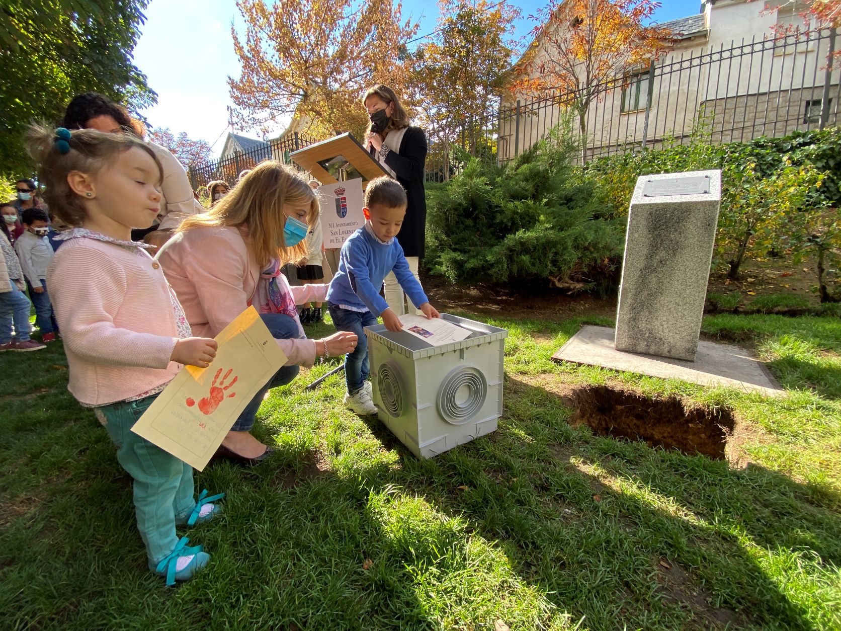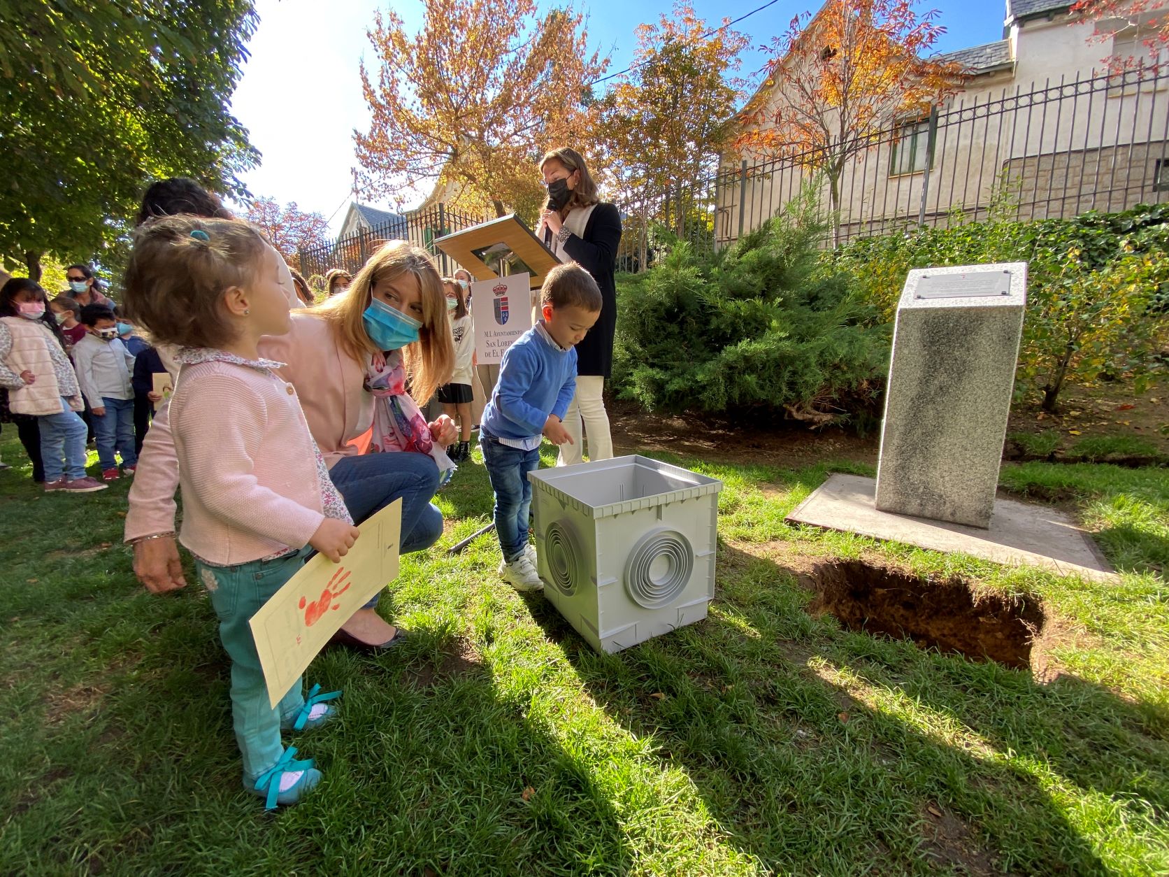 La cápsula se ha situado ante un monolito conmemorativo en el que una placa recordará el comportamiento responsable y ejemplar de los niños y las niñas de San Lorenzo durante la pandemia, y será abierta dentro de 25 años para recordar lo que dejamos atrás.