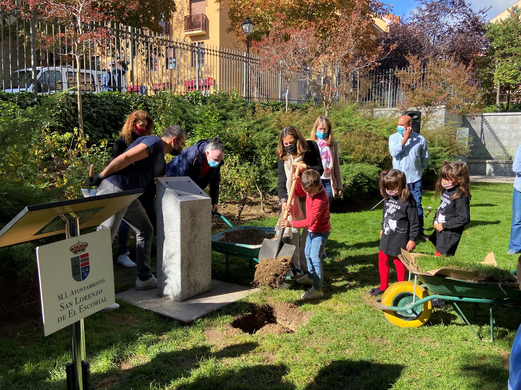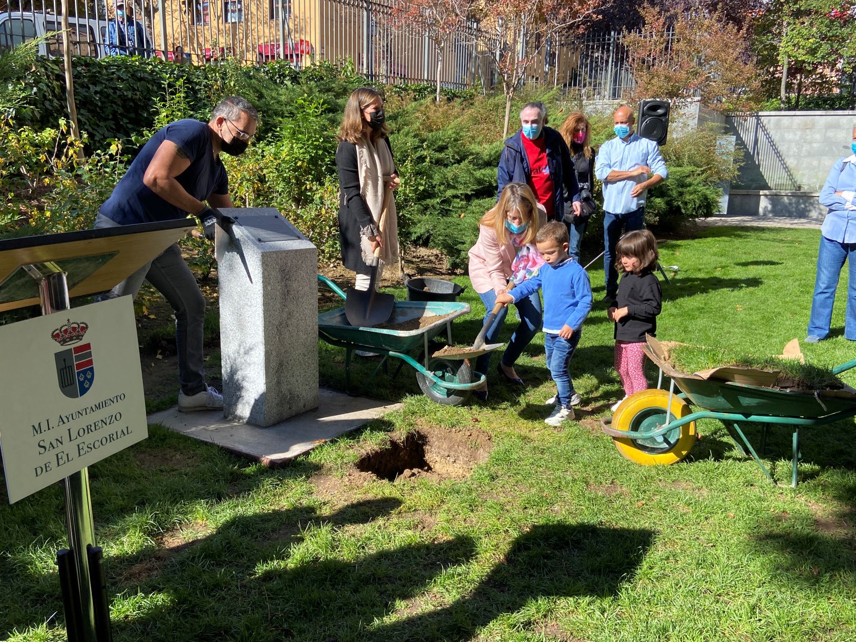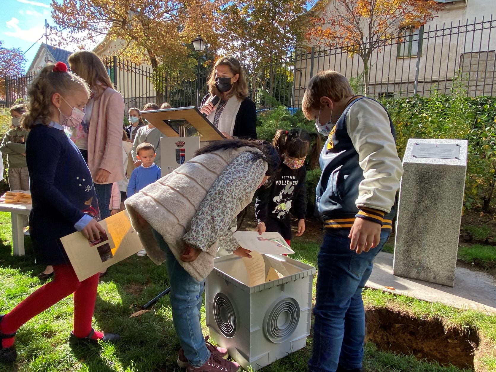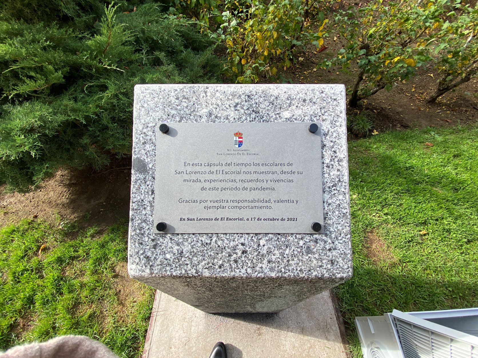 La cápsula se ha situado ante un monolito conmemorativo en el que una placa recordará el comportamiento responsable y ejemplar de los niños y las niñas de San Lorenzo durante la pandemia, y será abierta dentro de 25 años para recordar lo que dejamos atrás.