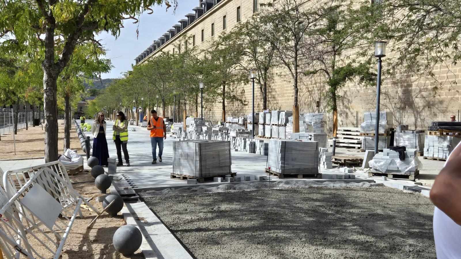 En este punto, ya está finalizada la instalación de la red de evacuación de agua en toda la vía, donde se han colocado sumideros laterales y pozos de registro a falta de realizar la conexión final. Se ha ejecutado la solera en el tramo de calle correspondiente a la fachada principal del Monasterio, con subbase, base de hormigón y materiales de alta resistencia.