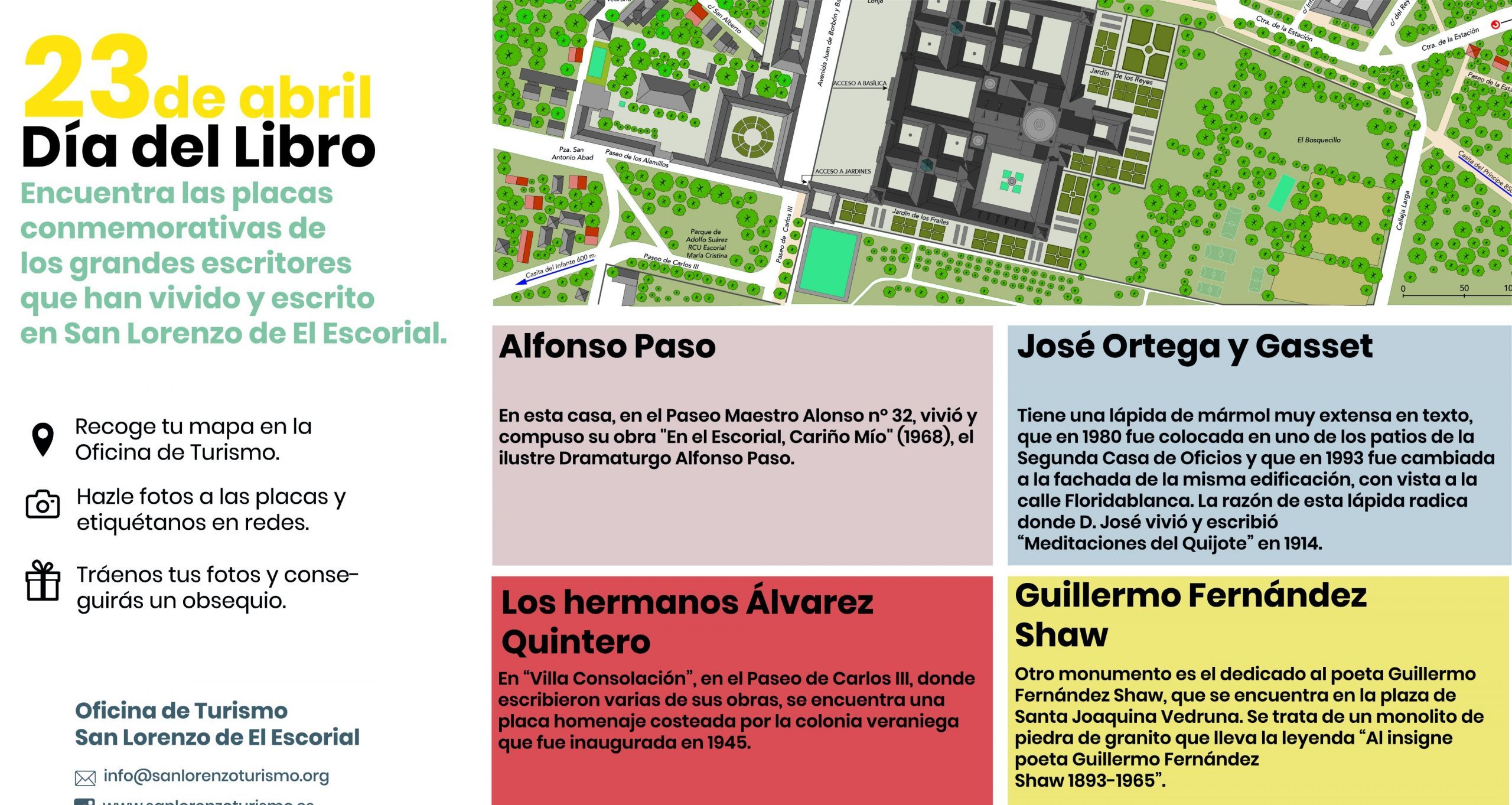 Para disfrutar del Día del Libro, que se celebra este viernes 23 de abril, la Oficina de Turismo de San Lorenzo de El Escorial propone realizar una ruta turística literaria en busca de las placas conmemorativas de los grandes escritores que han vivido y escrito en el municipio para, una vez completada, obtener un obsequio.